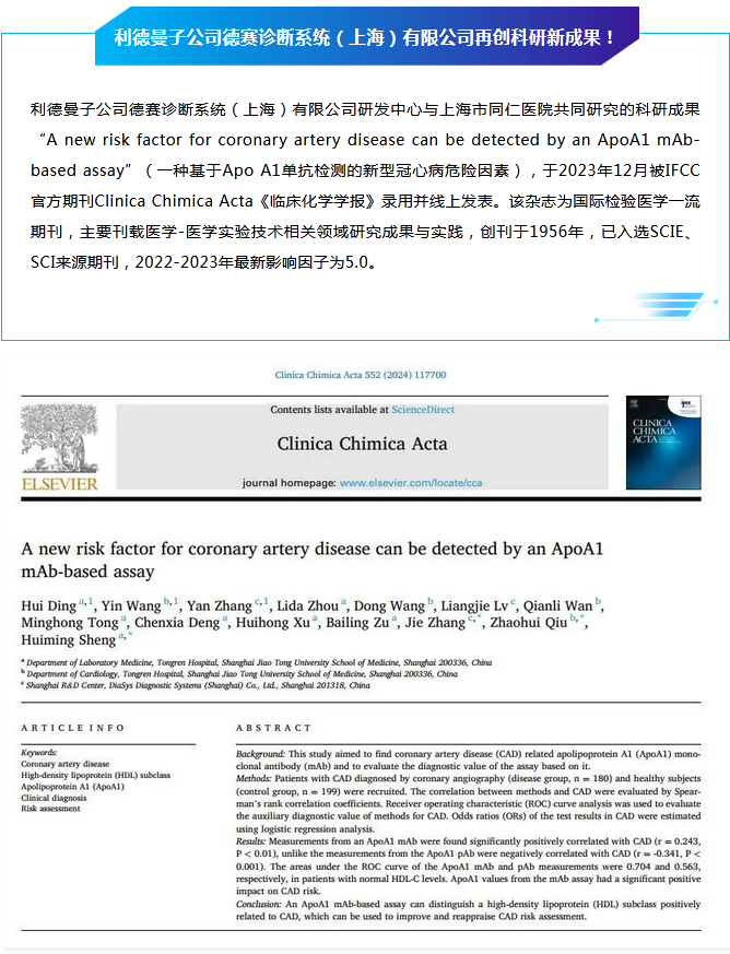 科研创新 │ 九州注册(中国)子公司德赛诊断系统(上海)有限公司联合上海市同仁医院再创科研新成果